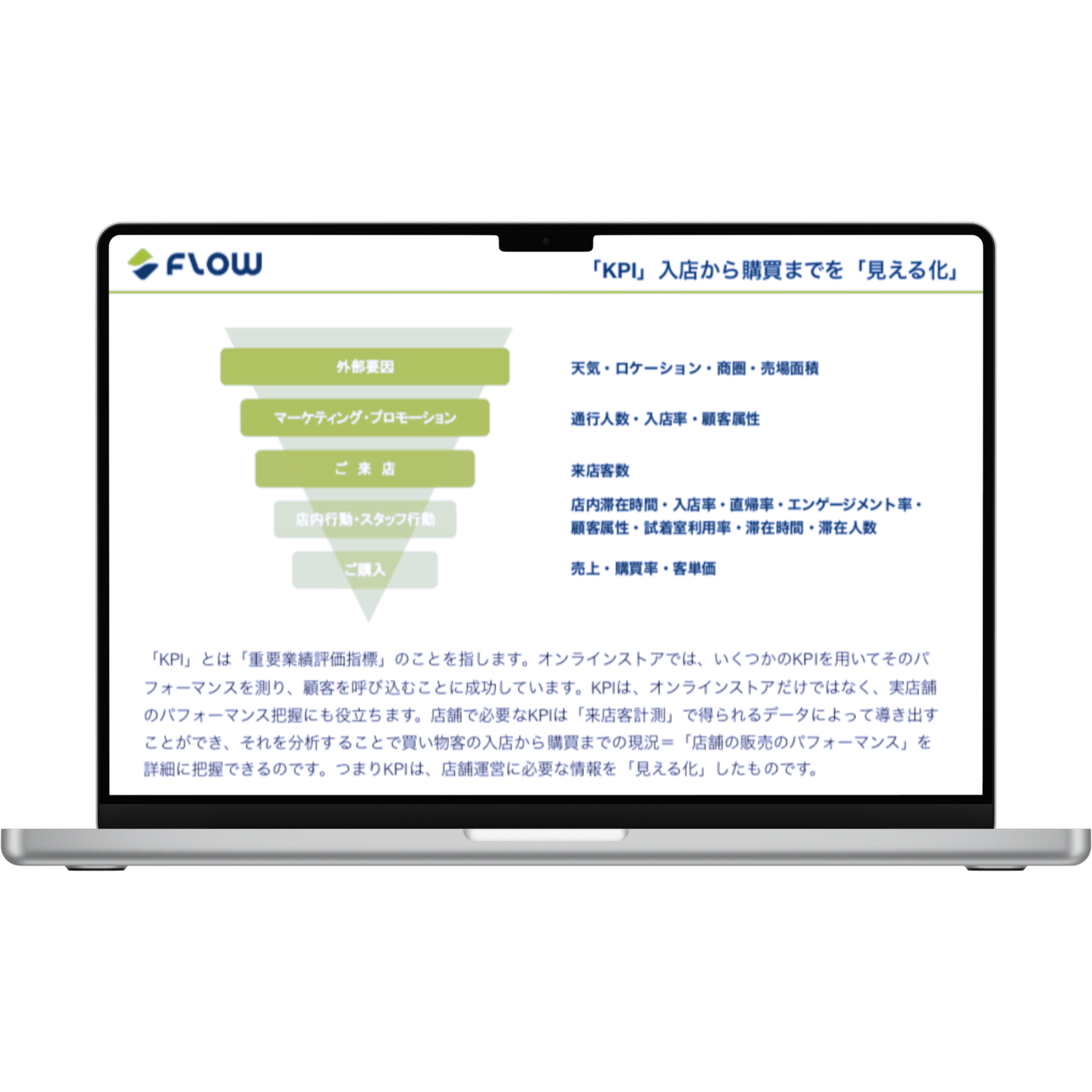KPIとは、企業の経営状態を把握するための、重要業績評価指標のことをいいます。小売店で「来店客数」を計測することで、店舗分析に必要なさまざまなKPIの数値を算出することができます。